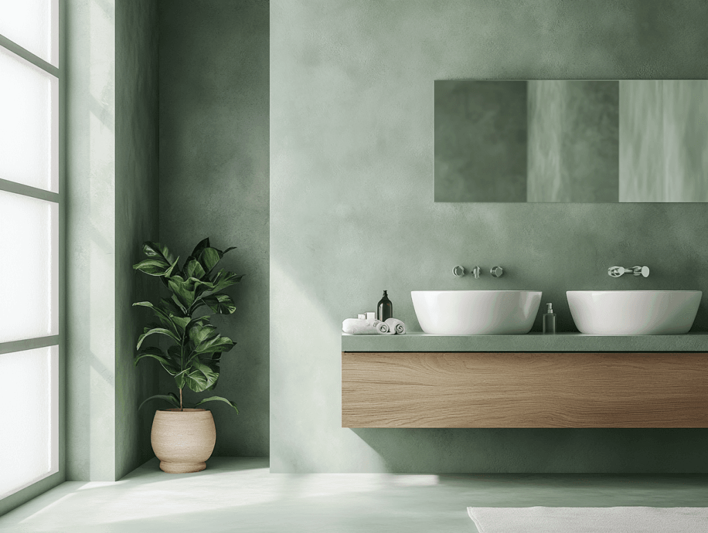 Ванна кімната — особлива зона для мікробетону. Тут матеріал контактує з постійною вологою, парою, мийними засобами, і до фінішного покриття висуваються підвищені вимоги. Для ванних кімнат матовий віск підходить менше — він менш стійкий до постійного зволоження. Оптимальний вибір: глянцевий або сатиновий віск, або поліуретанний лак (2–3 шари) для максимального захисту.