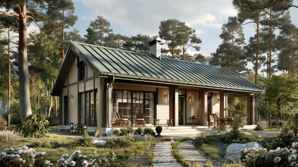 Максимальная графичность достигается при использовании глубоких черных оттенков кровли (RAL 9005 или RAL 9004). Классическая черная крыша ral и светлый фасад дома создают динамичный образ, который никогда не теряет актуальности. Такое решение визуально “приземляет” здание, делая его более массивным и стабильным, что особенно полезно для домов с высокими стенами или сложной многоуровневой архитектурой.